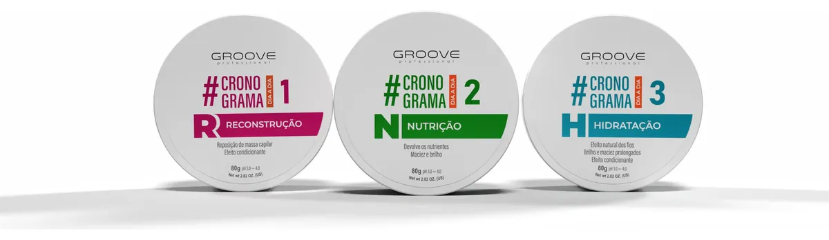 Kit Cronograma Capilar Groove Professional - 3 Produtos de 80gr cada Transforme seus cabelos com o Kit Cronograma Capilar Groove Professional. Este kit completo foi desenvolvido para recuperar a saúde dos fios, proporcionando força, brilho e maciez. Ideal para quem deseja um tratamento profundo e eficaz. O que o kit contém: 1 - Máscara de Reconstrução | Reposição de Massa Capilar | Efeito Condicionante - Recupera a estrutura dos fios danificados; - Devolve força e resistência; - Promove hidratação profunda. Modo de uso: - Após lavar os cabelos, aplique nos fios úmidos. - Deslize as mãos de cima para baixo nas mechas para melhor absorção. - Deixe agir de 7 a 15 minutos. - Enxágue abundantemente e finalize como desejar. 2 - Máscara de Nutrição | Nutrição Intensa | Brilho Radiante | Controle do Frizz - Fórmula com ativos naturais para nutrição profunda; - Deixa os fios macios e brilhantes; - Controla o frizz e melhora a maleabilidade. Modo de uso: - Após lavar os cabelos, aplique nos fios úmidos. - Massageie mecha a mecha para melhor absorção. - Deixe agir de 7 a 15 minutos. - Enxágue abundantemente e finalize como desejar. 3 - Máscara de Hidratação | Hidratação Profunda | Brilho e Maciez Prolongados - Aumenta a retenção de umidade nos fios; - Mantém os cabelos saudáveis e macios; - Proporciona efeito condicionante e toque sedoso. Modo de uso: - Após lavar os cabelos, aplique nos fios úmidos. - Massageie mecha a mecha para melhor absorção. - Deixe agir de 7 a 15 minutos. - Enxágue abundantemente e finalize como desejar. Como Fazer um Cronograma Capilar O cronograma capilar é um tratamento completo que intercala hidratação, nutrição e reconstrução ao longo do mês, de acordo com a necessidade dos seus cabelos. Sugestão de Cronograma: Cabelos ressecados: 1ª Semana: Hidratação - Nutrição - Hidratação 2ª Semana: Nutrição - Hidratação - Reconstrução 3ª Semana: Hidratação - Nutrição - Hidratação 4ª Semana: Nutrição - Hidratação - Reconstrução Cabelos danificados e quebradiços: 1ª Semana: Nutrição - Hidratação - Reconstrução 2ª Semana: Hidratação - Nutrição - Hidratação 3ª Semana: Nutrição - Hidratação - Reconstrução 4ª Semana: Hidratação - Nutrição - Hidratação Cabelos normais: 1ª Semana: Hidratação - Nutrição - Hidratação 2ª Semana: Nutrição - Hidratação - Nutrição 3ª Semana: Hidratação - Nutrição - Hidratação 4ª Semana: Nutrição - Hidratação - Nutrição Siga o cronograma e conquiste fios saudáveis e deslumbrantes. Garanta já o seu Kit Cronograma Capilar Groove Professional!