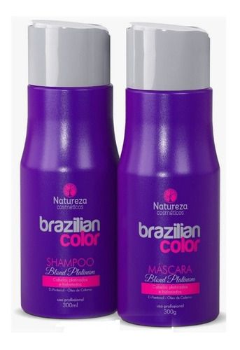 O Shampoo Blond Platinum Brazilian Color Natureza, foi formulado para os fios parcialmente ou totalmente tingidos, tira o tom amarelado e dá brilho aos fios. Ele mantém a cor pós-tintura e evita os danos causados pelo s próprios tratamentos químicos e raios solares, que é um dos grandes vilões do desbotamento. O shampoo Blond Platinum Brazilian Color garante a limpeza e a ativação do brilho natural dos fios. Seus cabelos ficam limpo, com a cor preservada e brilho radiante.A Máscara Blond Platinum Brazilian Color Natureza, foi desenvolvida para a neutralização dos tons amarelados, devolvendo a umidade natural dos fios. Enriquecida com D-Pantanol e Óleo de Calamamo, proporciona muito mais brilho e sedosidade aos fios, além de proteger as fibras, reforçando sua resistência a danos mecânicos e Químicos.Modo de Usar:Após lavar os cabelos com shampoo Blond Platinum , retire com excesso de agua e aplique a mascara silver black aplique massageando po 1 minuto eluvando mecha por mecha , e deixe agir por 5 a 10 minutos. enxague bem.Conteúdo da Embalagem:1 Shampoo Blond Platinum 300ml Brazilian Color Natureza Cosméticos1 Condicionador Blond Platinum 300ml Brazilian Color Natureza Cosméticos