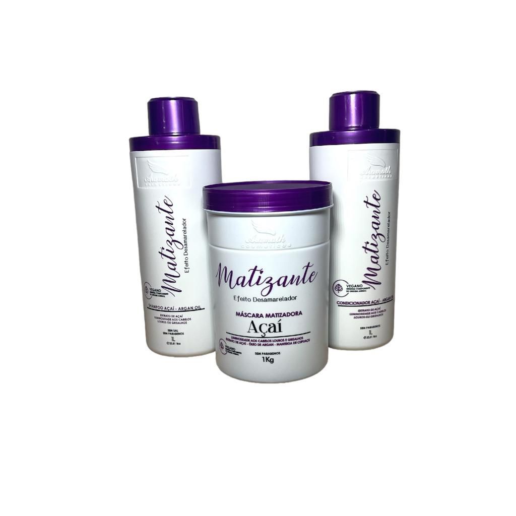 O Kit Tratamento Profissional Matizante Extrato de Açai foi desenvolvido com ativos de alto poder de reestruturação como o Óleo de Argan que regenera a parte interna e externa dos fios e o Extrato de Açai que protege o couro cabeludo e combate os radicais livres produzidos quando expomos os cabelos ao sol e agressões causadas por processos químicos como tinturas e alisamentos.