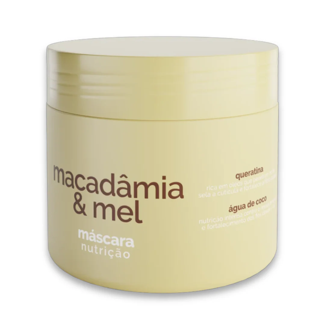 Máscara de tratamento Avelã com Macadâmia para cabelos secos e ressecados. Nutre profundamente os fios, repondo a massa capilar perdida, proporciona maior resistência à fibra capilar frágil.