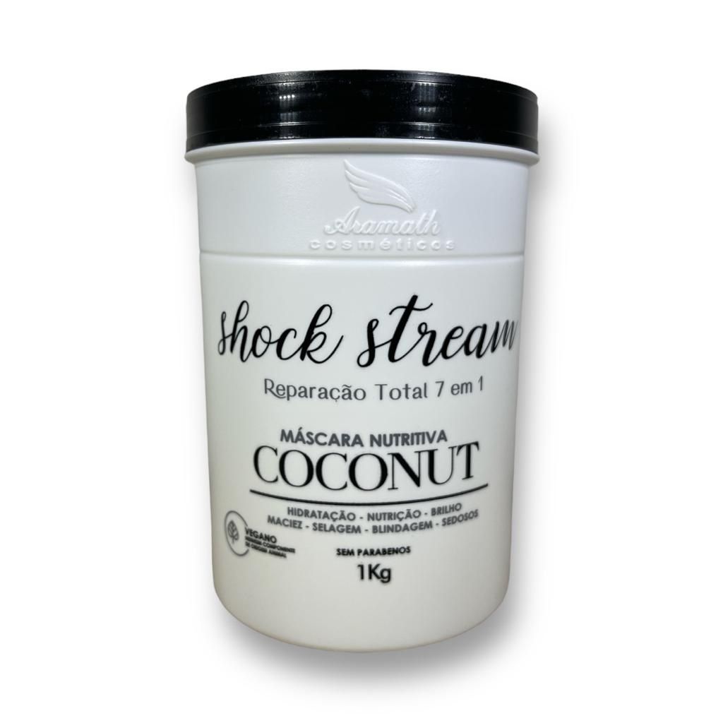 LANÇAMENTO ARAMATH COSMÉTICOS!!!! embalagem com 1 kg Schock Stream Reparação Total 7 em 1 Com Óleo de Coco A Máscara Schock Stream 7 em 1, foi elaborada com ativos capilares de alto impacto e tecnologia avançada. Enriquecido com Óleo de Coco, rico em Vitamina E e ácidos graxos, ele é um poderoso hidratante que age na extrutura dos fios reconstruindo e fortalecendo. Manteiga de Murumuru e Manteiga de Cupuaçu que hidratam e restauram os cabelos, doando brilho e maciez juntamente com os Extratos de Mandioca e o Broto de Bambu que auxiliam no crescimento e também repõe a massa capilar perdida durante os processos químicos. Contém também Silicones Nobres que selam e blindam os fios. Reparação Total 7 em 1 Hidratação Reparação Intensiva Reposição de Massa Brilho/Maciez Crescimento dos Fios Selagem Blindagem