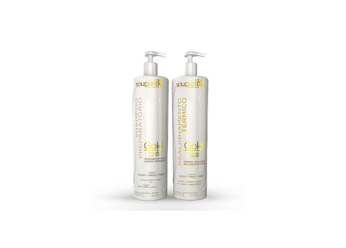 Souple Liss Gold: Liso e Reestruturação para os seus cabelos! A Linha Gold Souple Liss traz para você a melhor linha de realinhamento capilar do mercado, pois conta com as gotas de ouro formadas pelo blend de argan, mirra e Monoi, trazendo beleza, reestruturação e muito mais realinhamento para seus cabelos. O Shampoo preparador Gold Souple Liss limpa profundamente e prepara os fios para as transformações fornecidas pelos reconstrutores da linha gold souple liss, fazendo com que o tratamento seja mais duradouro e fortalecedor. O Realinhamento Térmico Gold Liss Souple Liss proporciona aos fios uma potente reestruturação capilar duradoura, e efetiva fornecendo ao fio a reconstrução de sua fibra capilar, gerando cabelos mais bonitos, saudáveis e cheios de vida.Kit com1 Realinhamento Térmico Gold Liss 1L Souple Liss1 Shampoo Preparatório Gold Pré 1L Souple Liss